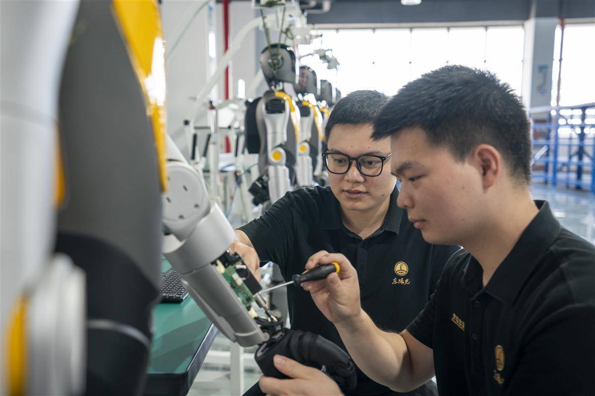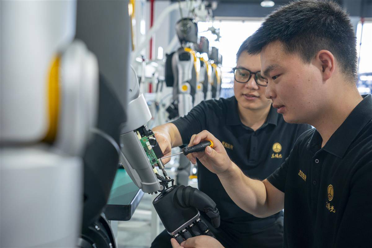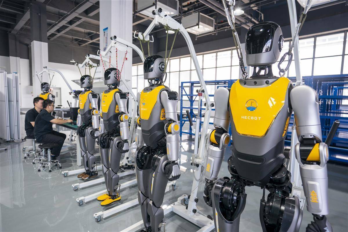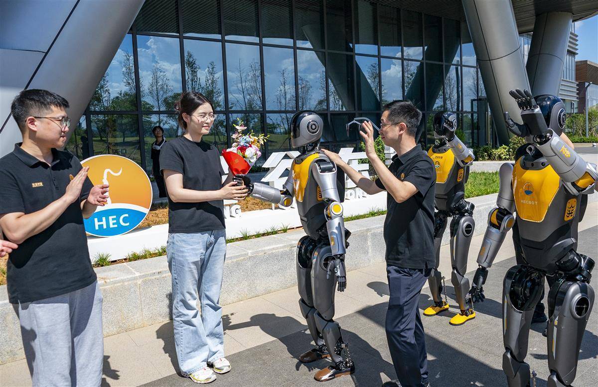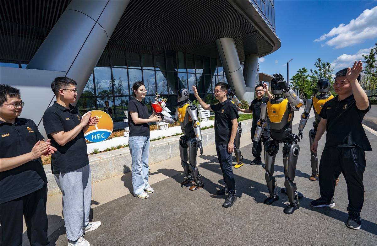 8月22日,在首届世界人形机器人运动会上夺得群体首金、湖北首金的部分“光子”人形机器人和技术团队,载誉回到武汉。不久前结束的首届世界人形机器人运动会上,光谷东智、朗毅机器人等湖北光谷人形机器人企业以及武汉大学刘胜院士团队参赛。北京舞蹈学院与光谷东智联合代表队由9台“光子”人形机器人与1名舞者组成,共同演绎《秦俑魂》,在群体舞蹈比赛中以92.54分夺得金牌。本届比赛共吸引来自五大洲16个国家的280支队伍、500余台智能机器人围绕26个赛项、538个比赛项目竞技,是全球首个以人形机器人为参赛主体的综合性体育竞技赛事。(湖北日报全媒记者 魏铼 摄)